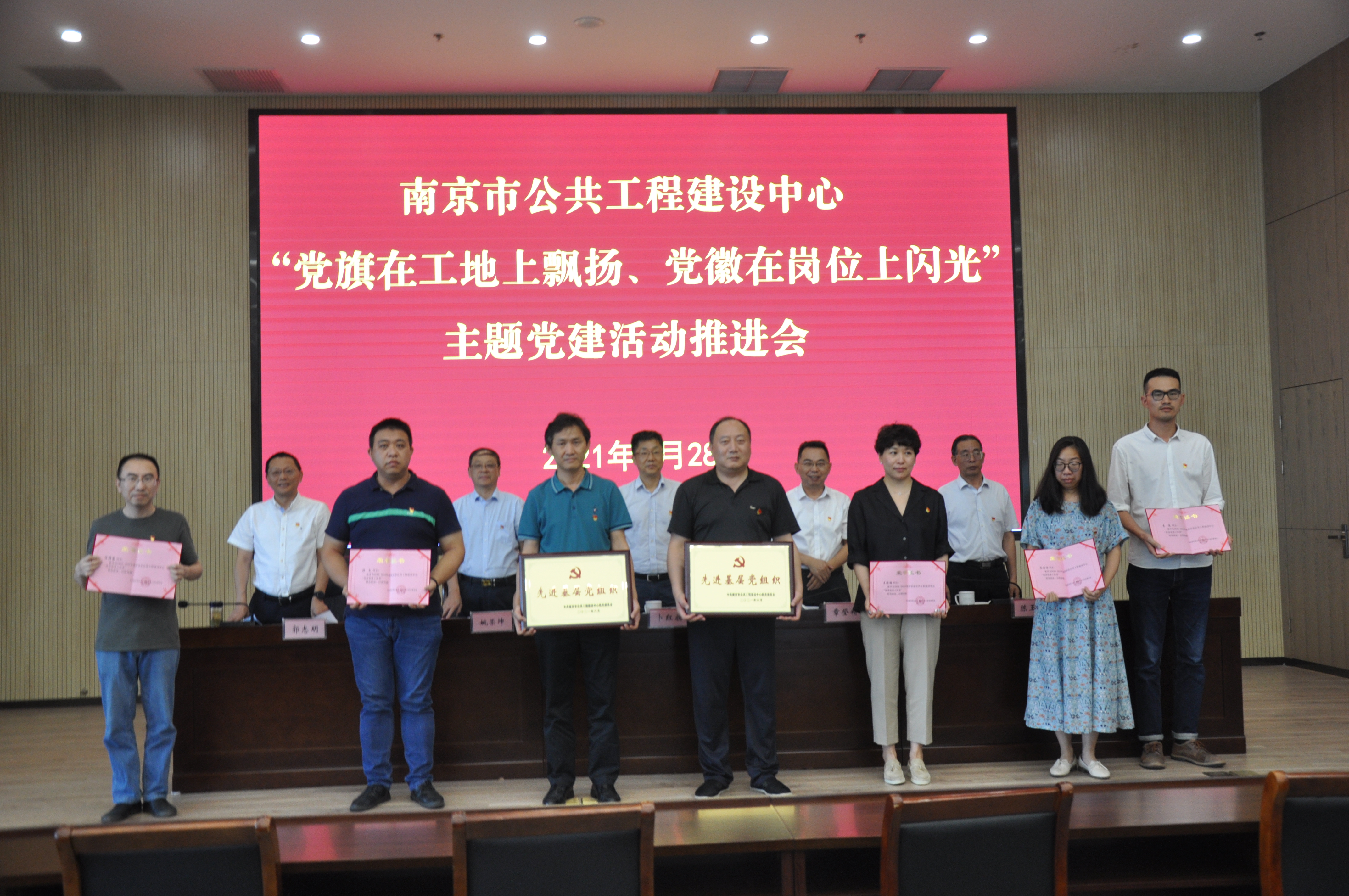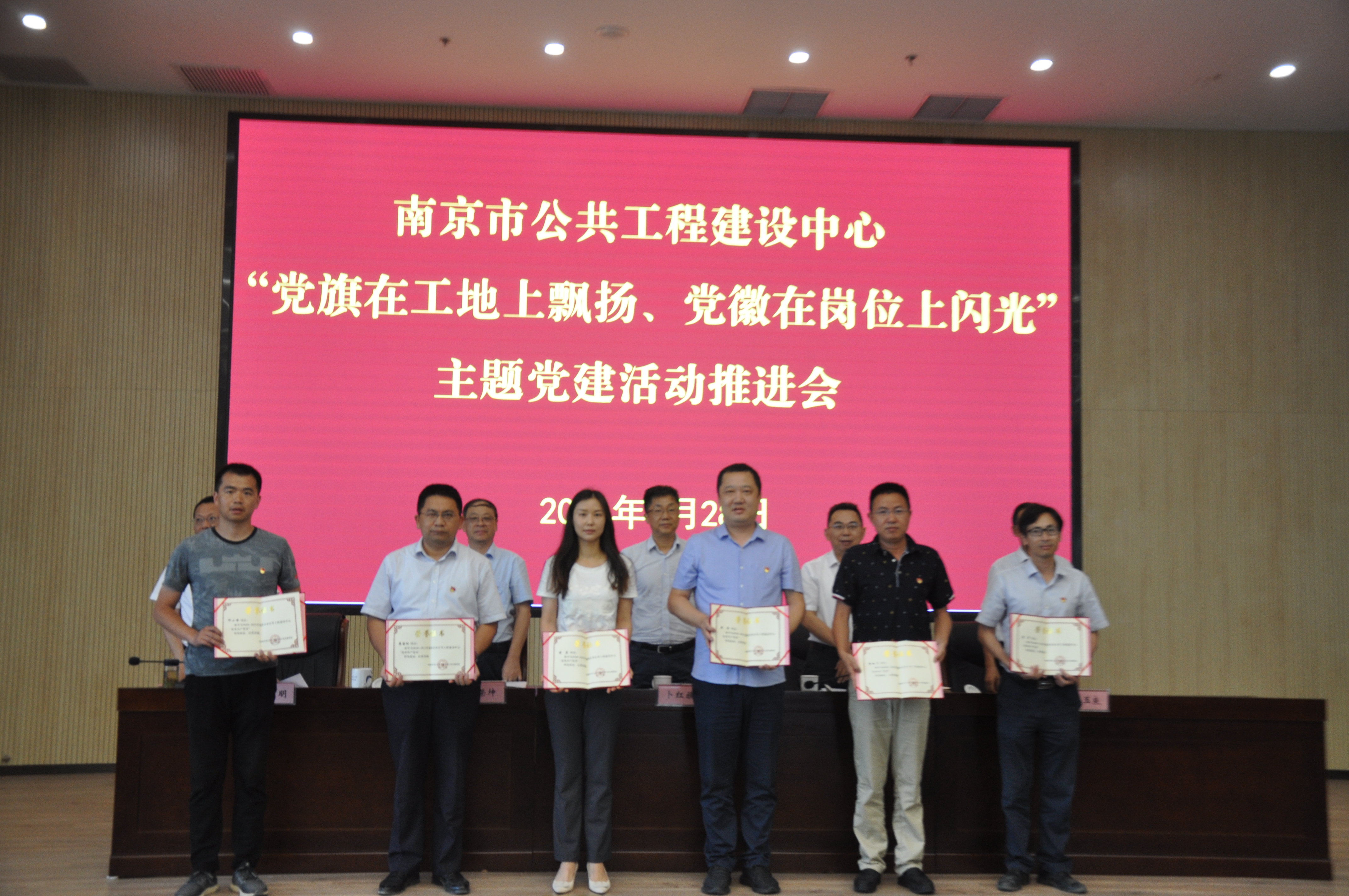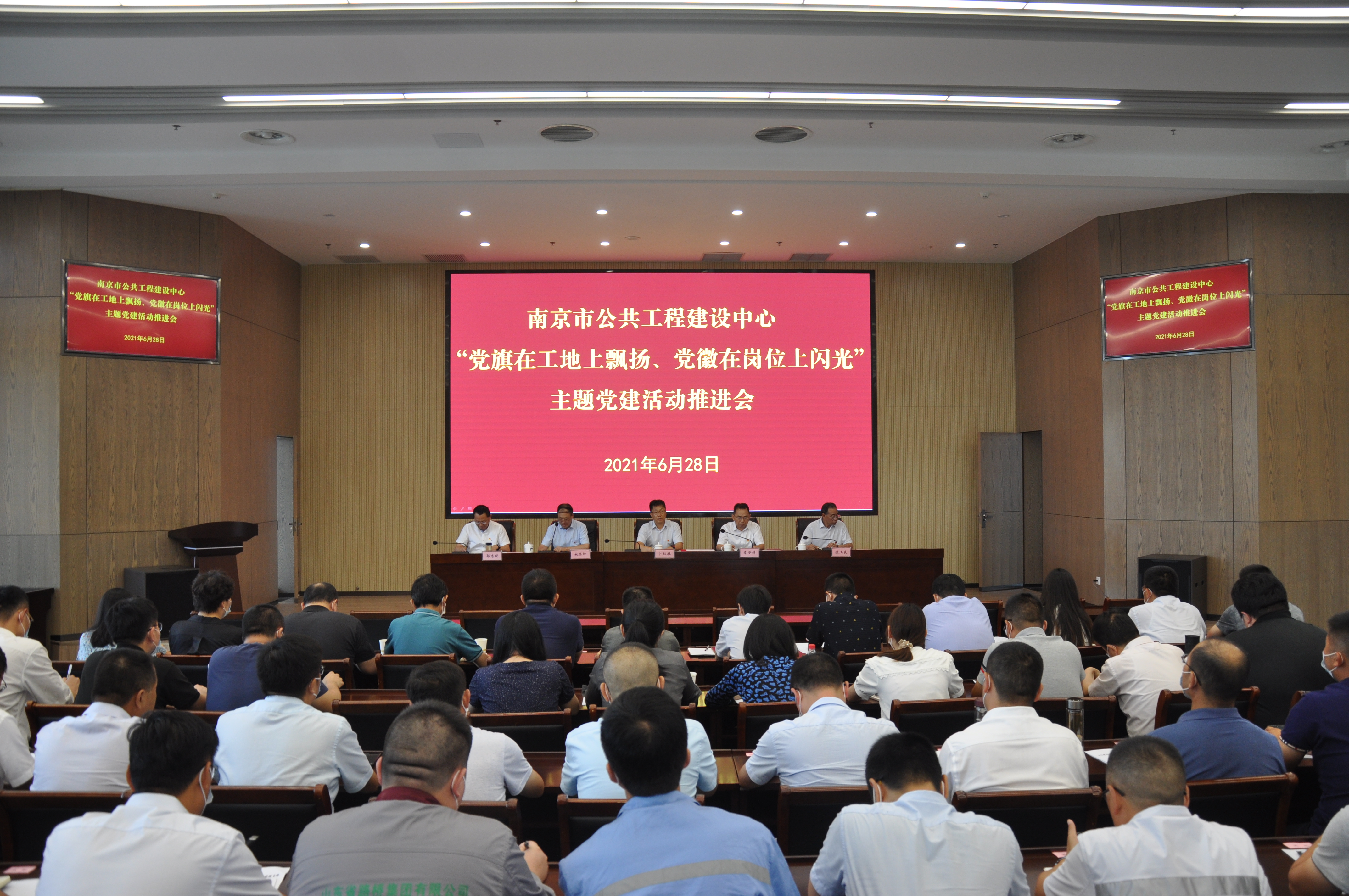 6月28日下午,市公建中心党组召开“党旗在工地上飘扬、党徽在岗位上闪光”主题党建活动推进会,市公建中心领导卜红旗、章登精、姚荣坤、陈玉良、郭志明出席会议,参加会议的有市公建中心全体党员和入党积极分子,重点工程参建单位现场项目部党组织(主题党建活动先进集体)负责人代表、主题党建活动优秀个人、优秀组织者等。