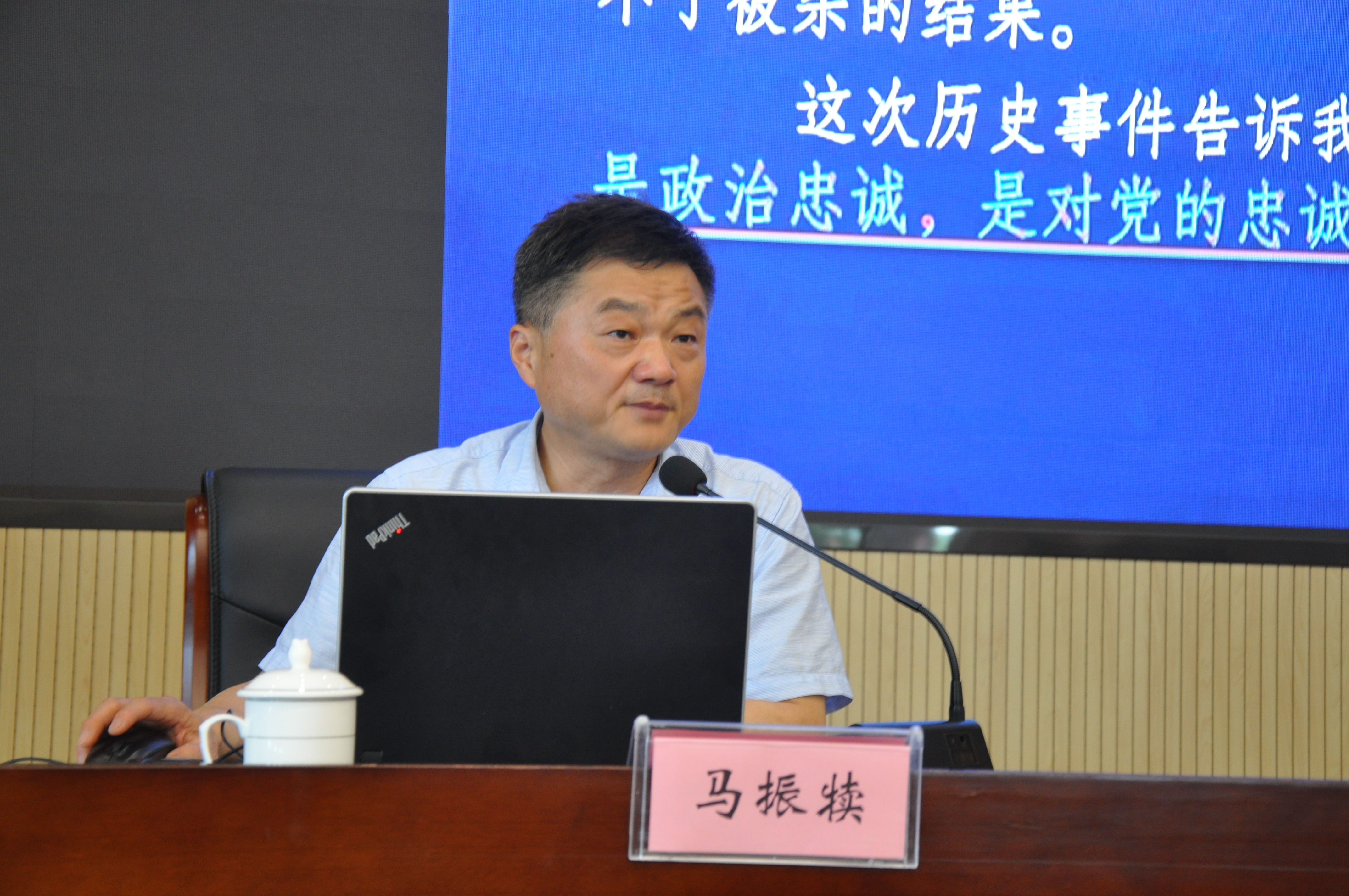 会议还邀请中国第二历史档案馆马振犊馆长上了题为《共产党员必须坚守信仰对党忠诚——顾顺章案件的历史启示》的党史学习教育专题党课。马馆长从顾顺章案件的历史真相及其影响和对案件的历史分析得出的教训与启示两个方面,多角度、多方位对历史进行了讲解;通过对案件深入的剖析启示,坚定执着的信仰,是共产党人的精神之钙、远航之灯、伟力之源,共产党员的忠诚最重要的是政治忠诚、是对党的忠诚、对共产主义信仰的忠诚。