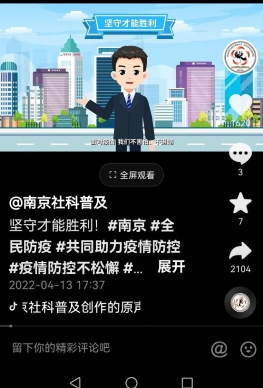 在本轮疫情防控中,市社科联(院)迅速反应、周密策划,紧扣南京抗疫重大主题,在“南京社科普及”抖音账号上,生动制作、呈现并发布了“文明祭扫 平安清明”和“坚守才能胜利”两期原创动漫微视频,累计浏览量69.7万,视频以直观、轻松、明快的形式,传播宣传了有关防疫措施、普及防疫知识,联院党员干部还在核酸检测现场和值守点,向群众发放《科学抗疫 保护自己》宣传册,极大增强了广大市民的自我防护意识。