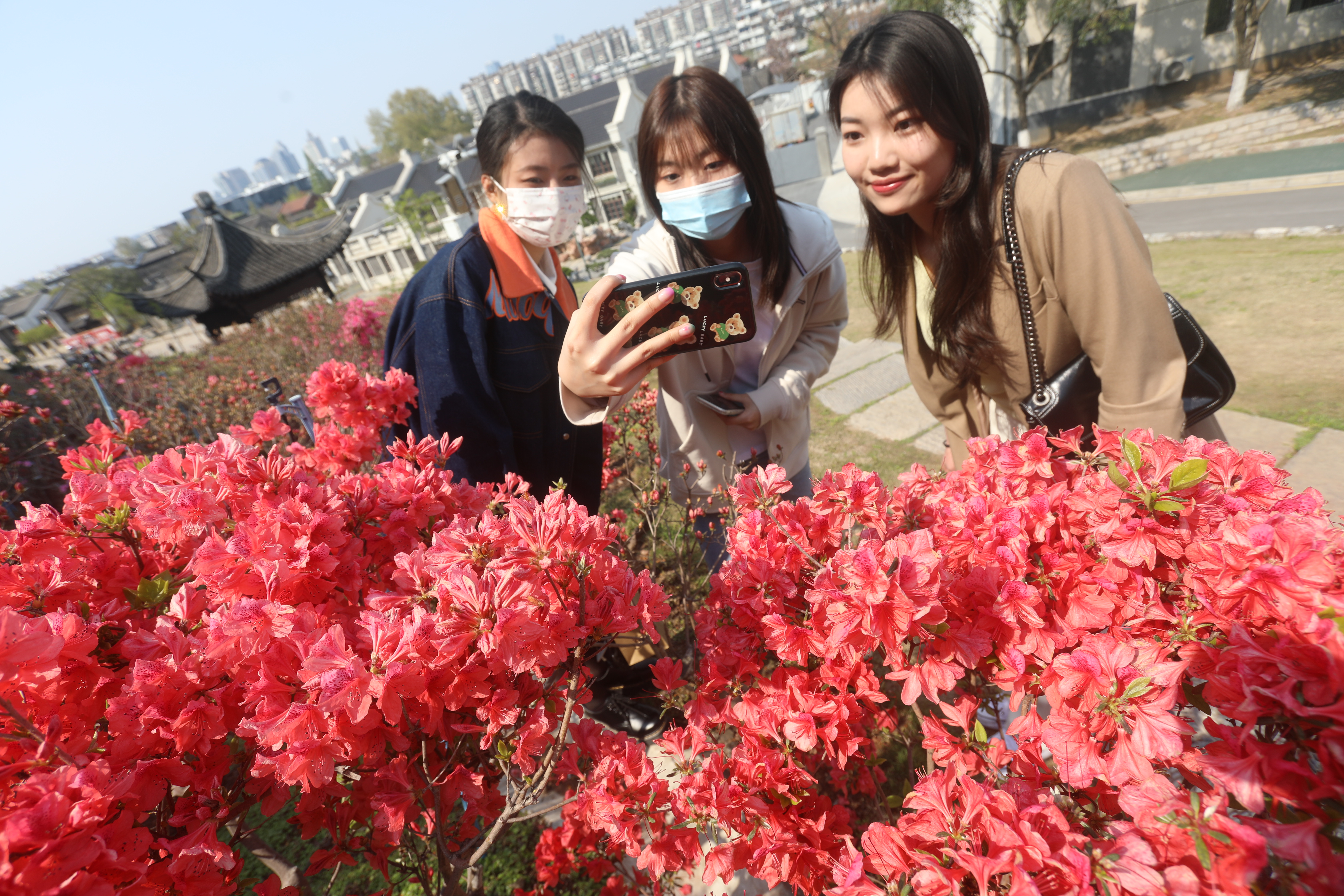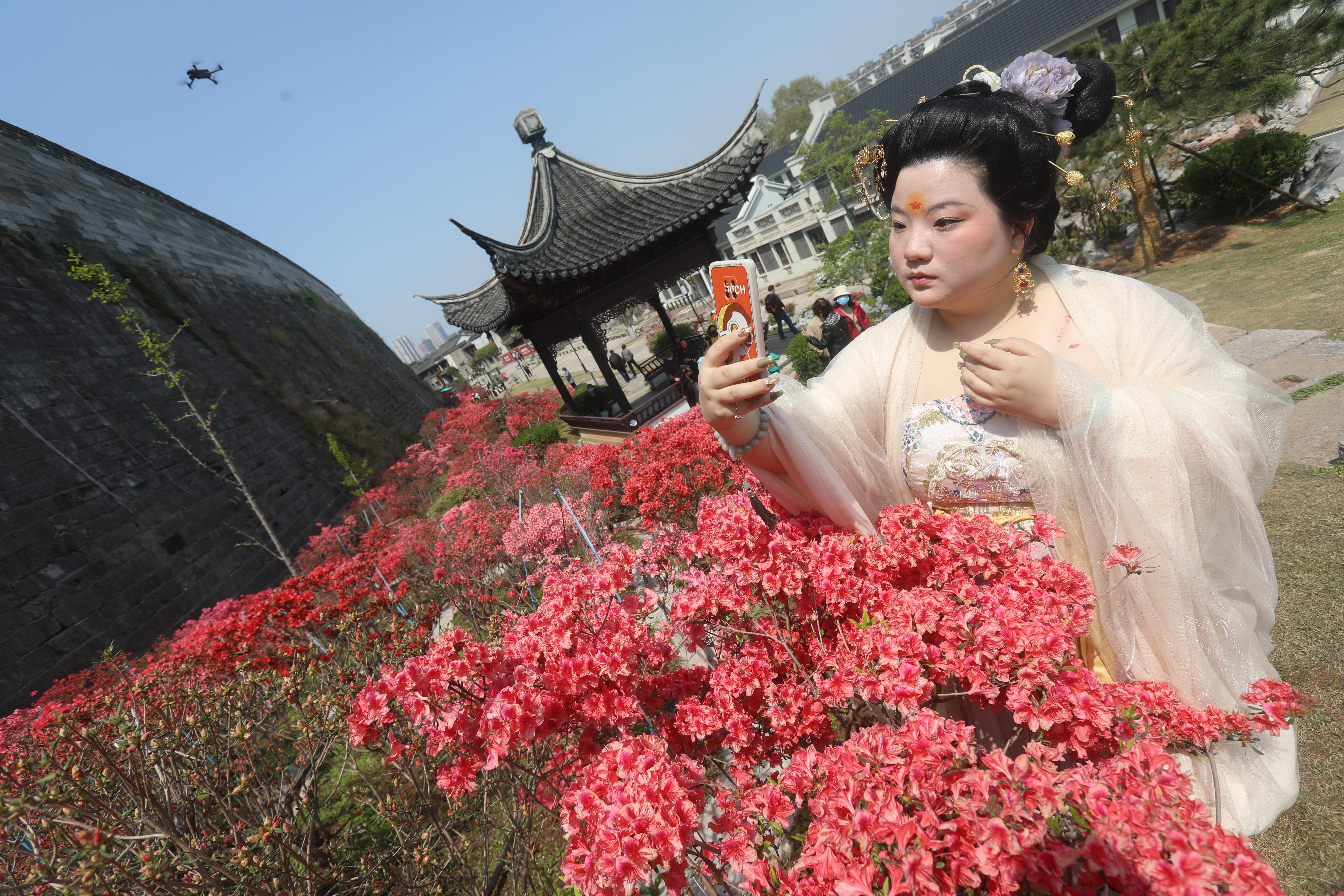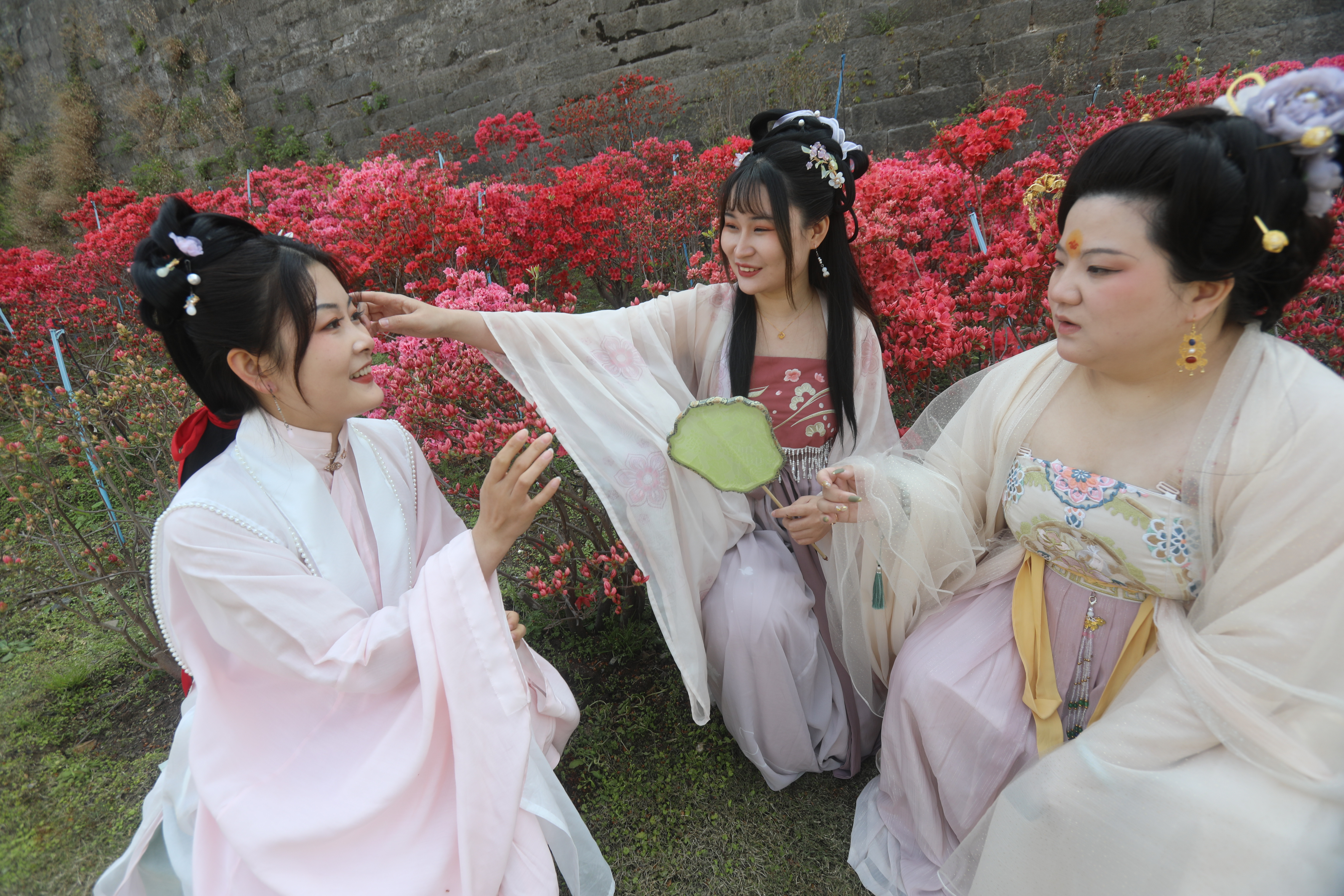 2022年4月3日,江苏南京老门东景区,古老的明朝城墙脚下,数百米长的杜鹃花在和煦的春风里盛开,吸引游客前来赏花并打卡留念,人面杜鹃相印红。杜鹃花在阳光下灿若红霞,释放出生命的炙热,故又名映山红。南京市雨花台区商务局 刘小楚摄
