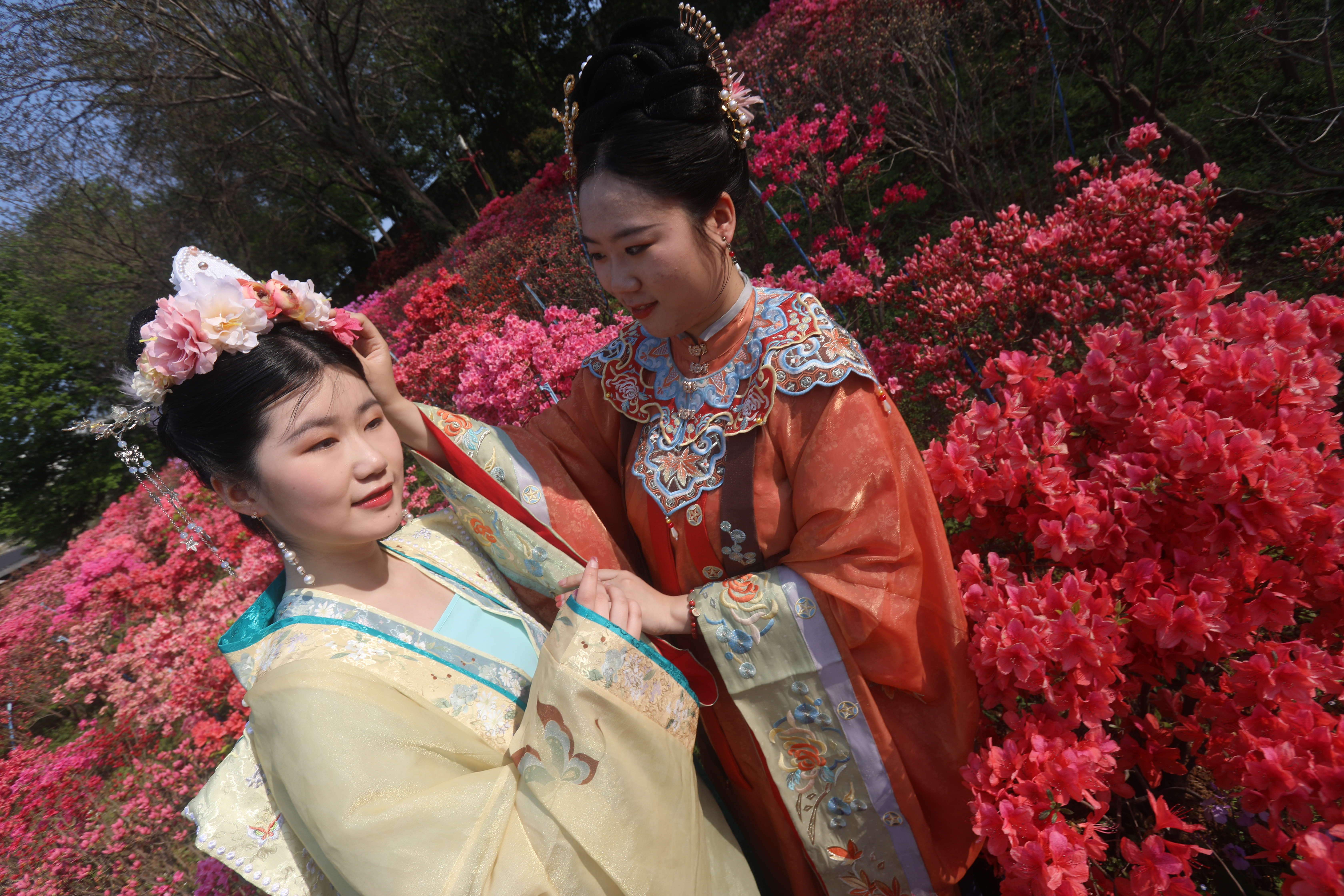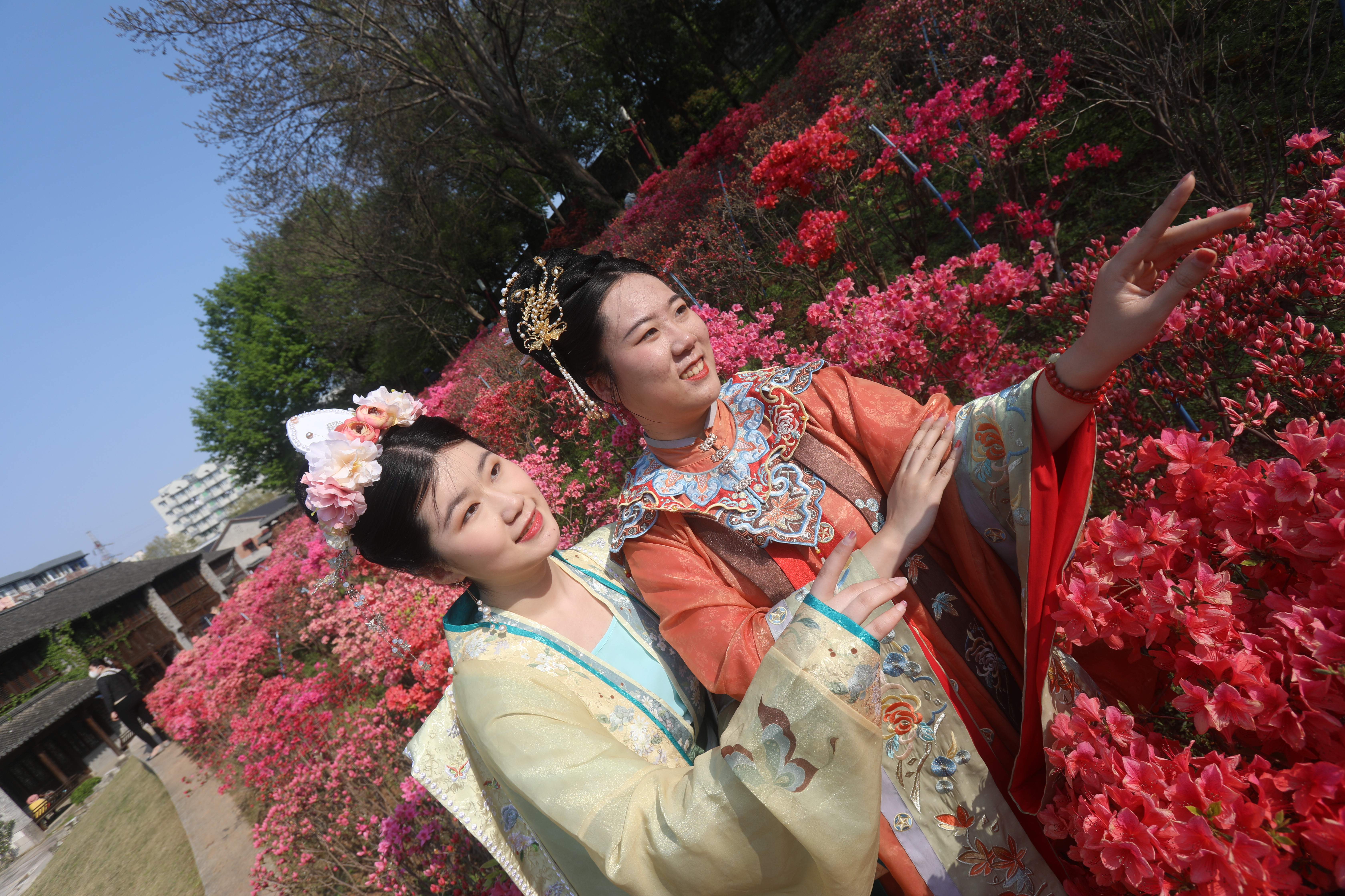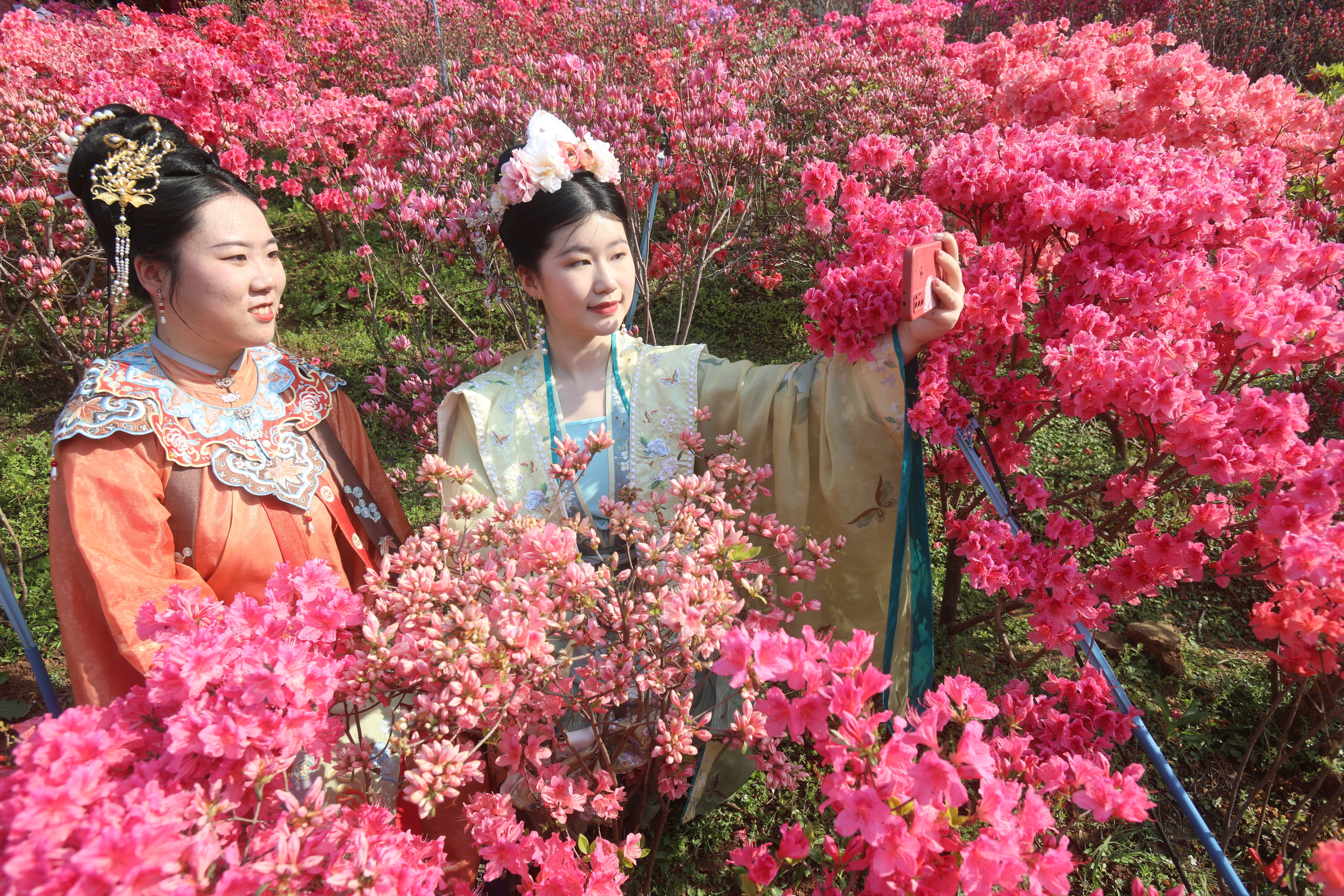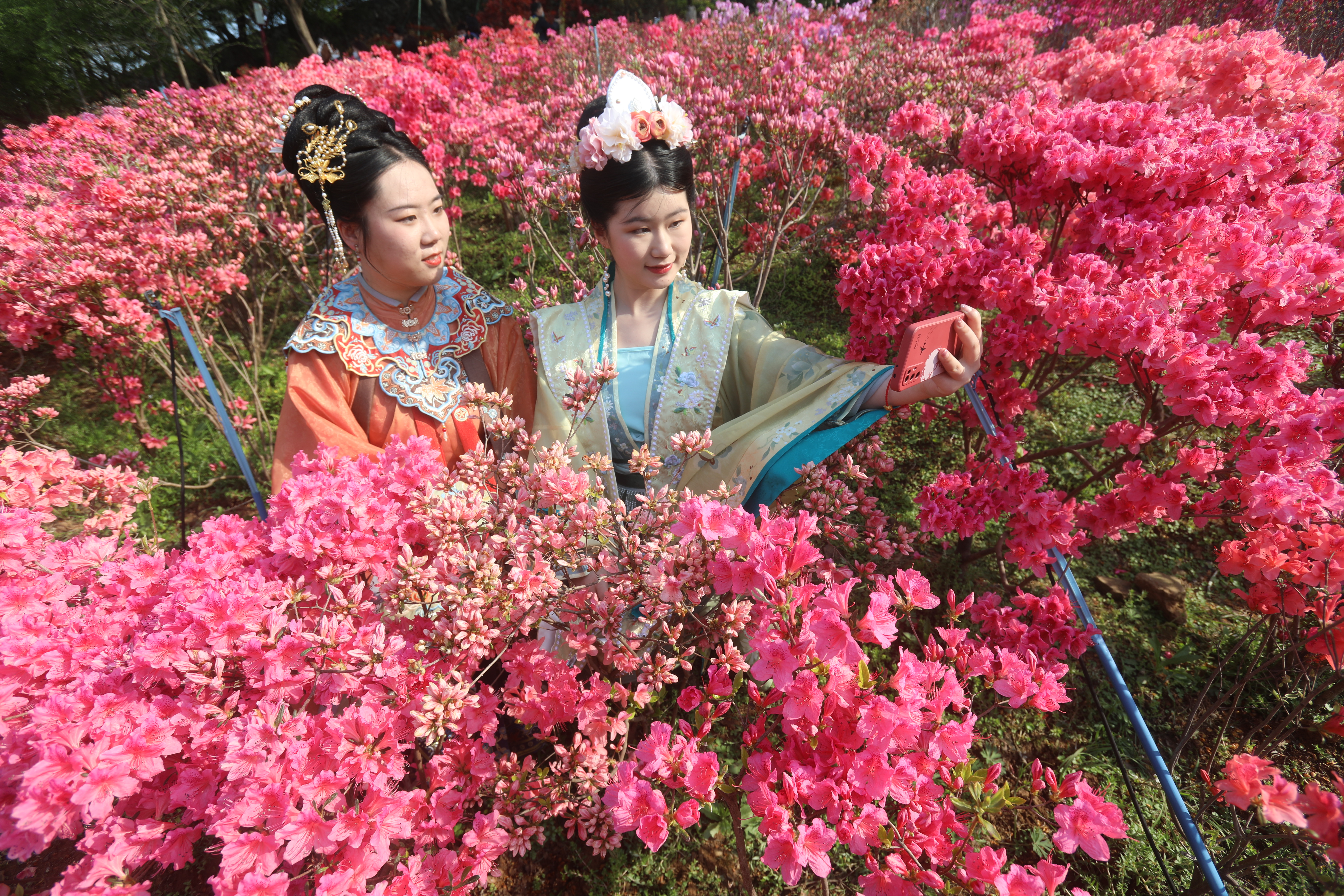 2022年4月3日,江苏南京老门东景区,古老的明朝城墙脚下,数百米长的杜鹃花在和煦的春风里盛开,吸引游客前来赏花并打卡留念,人面杜鹃相印红。杜鹃花在阳光下灿若红霞,释放出生命的炙热,故又名映山红。南京市雨花台区商务局 刘小楚摄