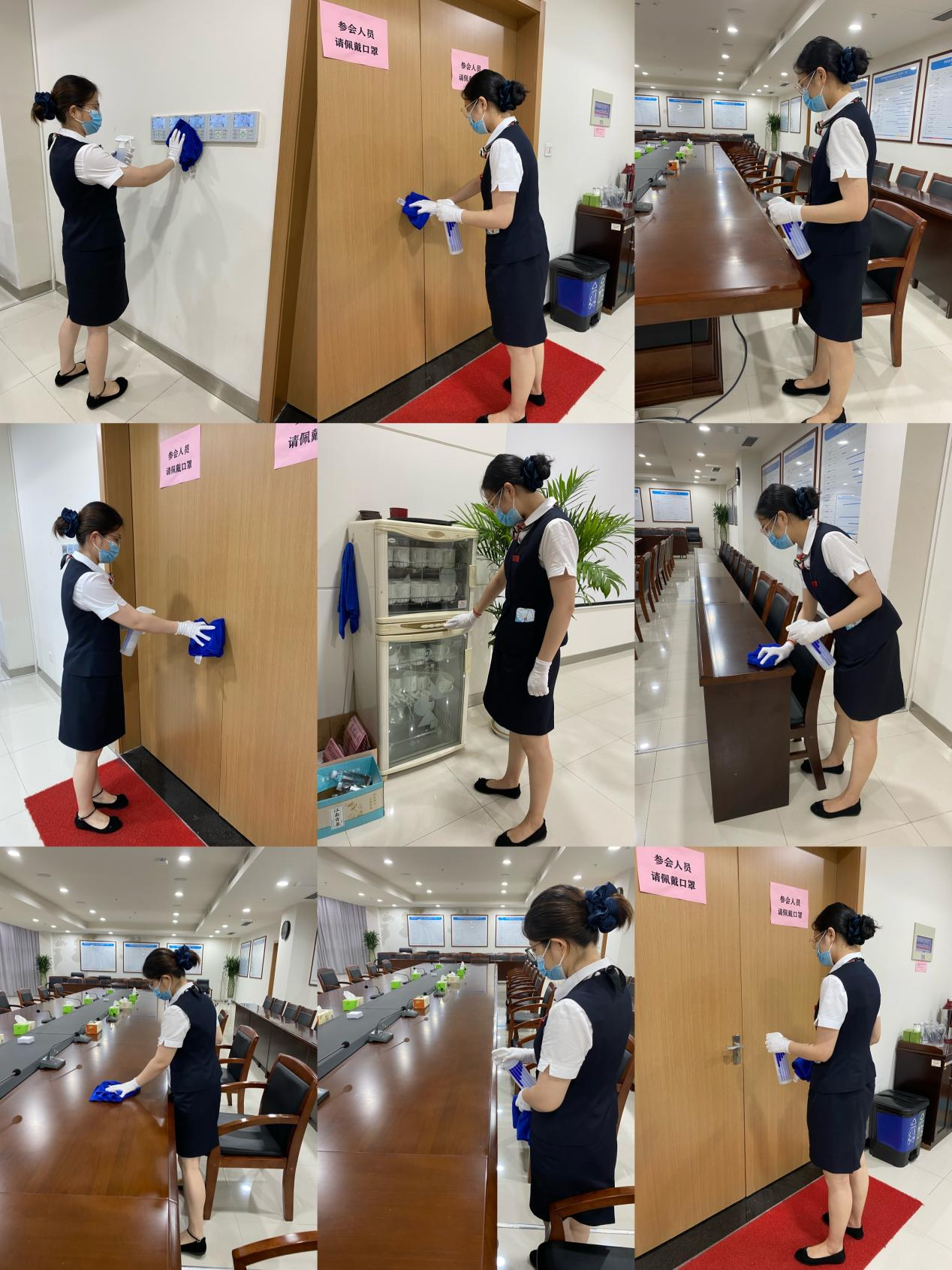 一、关口前移,筑牢安全防线。疫情防控、重任在肩,物业人时刻紧绷疫情防控这根弦,每日对集中办公区卫生间、电梯、走廊、垃圾站点、自行车棚、地库、废弃口罩回收箱等等700余处公共部位进行2次消毒,重点部位如电梯按键、地漏等部位每2小时1次消毒;在会议室入口设置1米警示线,每张会议桌都配备免洗手液、口罩、一次性消毒湿纸巾等防疫物品;为话筒配备一次性消毒护套,使用红外线测温仪对参会人员进行测温。会议前后对会场进行消毒、通风,所有使用茶具均采取紫光灯照射消毒,并在会议前对保障人员检测体温,查验苏康码。