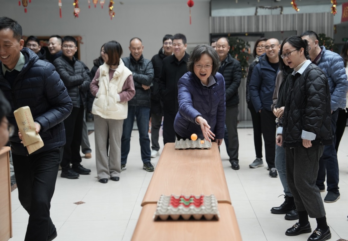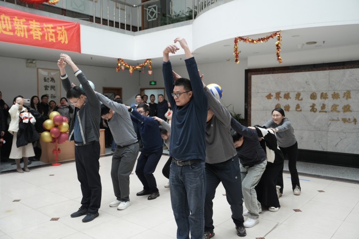 在手工拉花、二龙戏珠等一片红红火火充满年味的布置中,个人趣味游戏活动拉开了迎新春活动序幕。“龙转乾坤”游戏,有趣又具有挑战性,各位选手瞄准目标果断出手,每一次精准投入都能迎来现场一片欢呼和掌声;“旱地龙舟”游戏中,每组三名队员齐心合作、共同前进,中间加油声此起彼伏,到达终点后队员们激动拥抱跳跃,将现场氛围推向高潮。