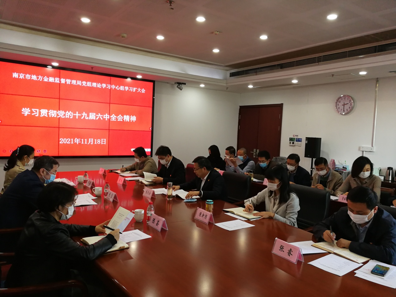 会上,朱长会领学了《中国共产党第十九届中央委员会第六次全体会议公报》、习近平总书记发表重要讲话的主要精神和全会审议通过的《中共中央关于党的百年奋斗重大成就和历史经验的决议》的主要内容。集体学习研讨时,朱长会以“深入学习贯彻党的十九届六中全会精神 不断谱写南京金融高质量发展崭新篇章”为题带头交流发言,其他4名局党组理论学习中心组成员也结合各自思想和工作实际,交流了学习心得体会。