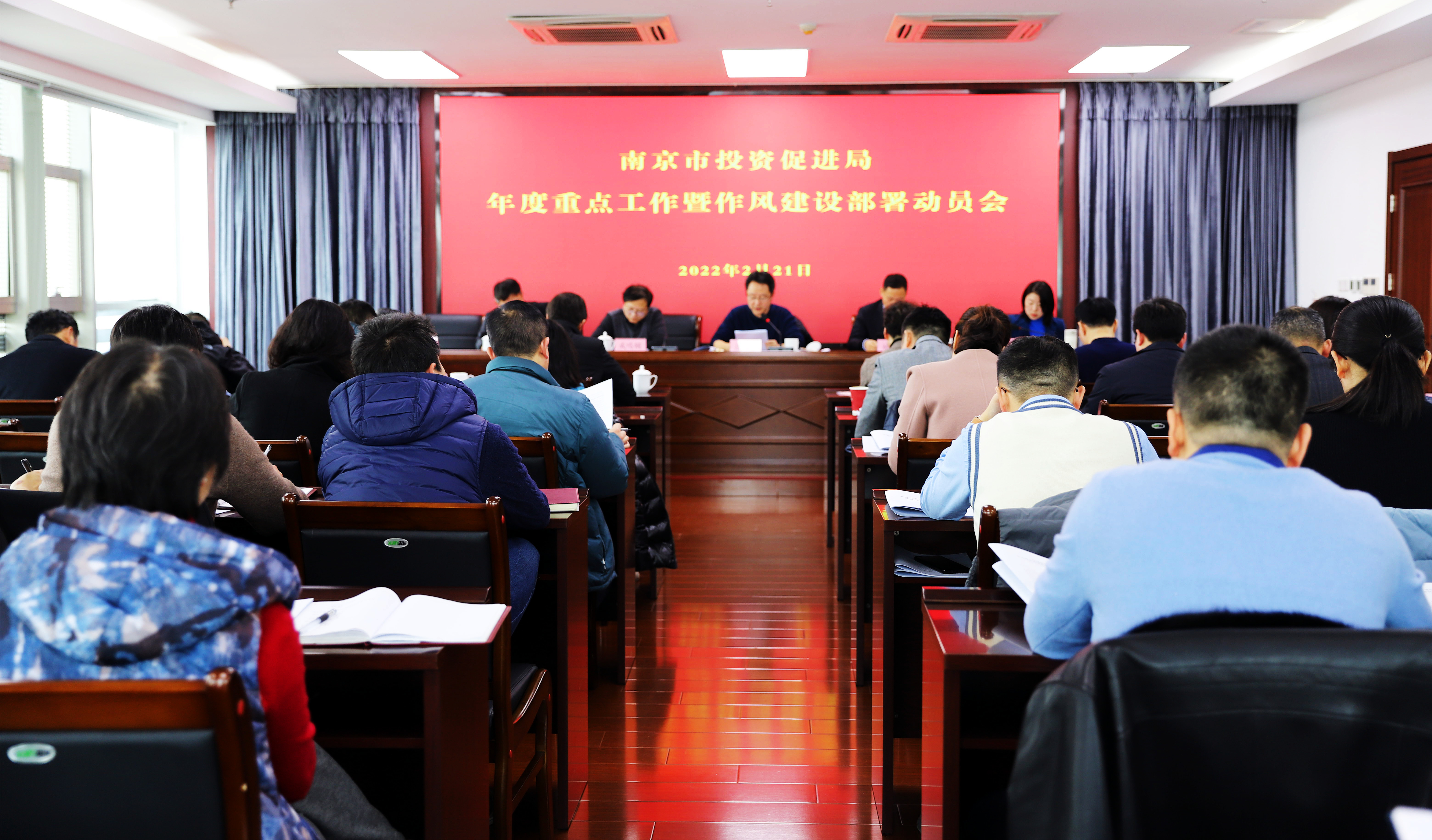 2月21日上午,南京市投资促进局召开年度重点工作暨作风建设部署动员会,总结2021年工作成效,部署2022年目标任务和重点工作。市纪委监委派驻纪检监察组组长张欣、市委市级机关工委副书记邓雷、市作风建设第八对口监督组副组长庄亚非等应邀列席会议,机关全体人员参加。