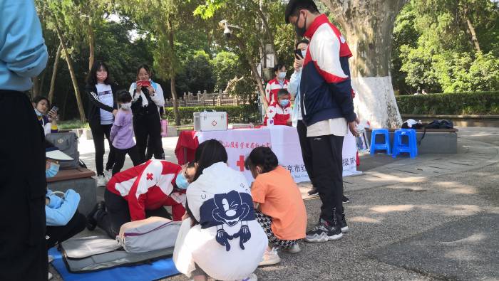 近日,南京市红十字会机关第一党支部会同南京市红十字赈济救援队机关分队和中山陵分队,开展5•1节假日景区应急救护保障志愿服务,副会长张杰带队参加了活动。服务队依托中山陵红十字救护站,在中山陵博爱牌坊设置流动志愿服务台,并准备了教学安妮和AED训练机为游客提供应急救护培训现场互动教学。