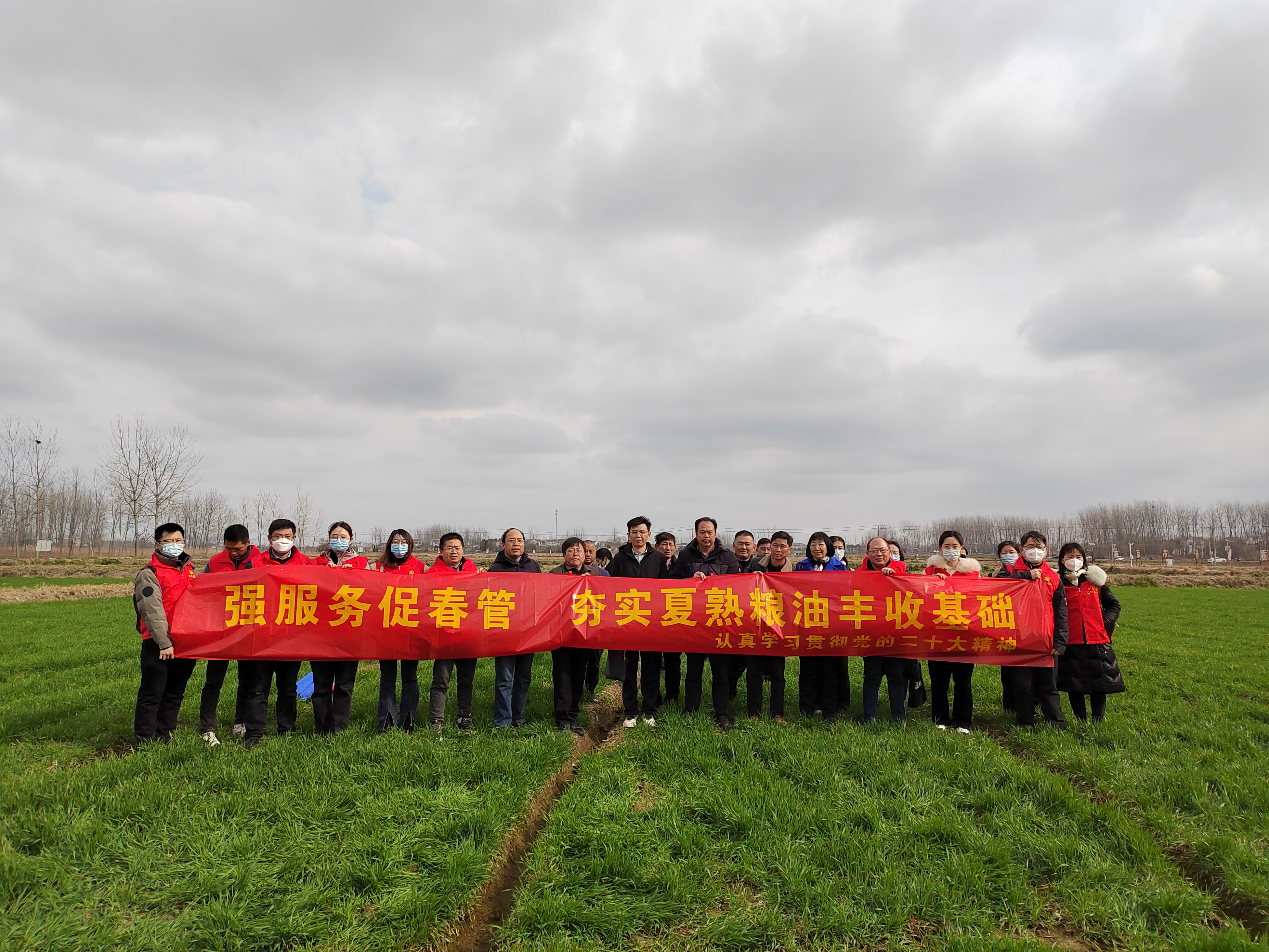 为完整准确全面领会党的二十大精神,认真贯彻落实中央一号文件及农业农村部关于抓好春季田管暨春耕备耕工作会议精神,2月21日,南京市农业技术推广站党支部联合江苏省农业技术推广总站党支部、六合区农业农村局机关二支部、南京骏圣生态农业有限公司党支部,四方共学共建,与春光争农时,送科技送服务到田间地头,开展“强服务促春管,夯实夏熟粮油丰收基础”主题党日活动。江苏省农技推广总站党支部副书记陈震,南京市农业技术推广站党支部副书记刘胜环,六合区农业农村局党委委员、副局长唐根胜参加本次活动。