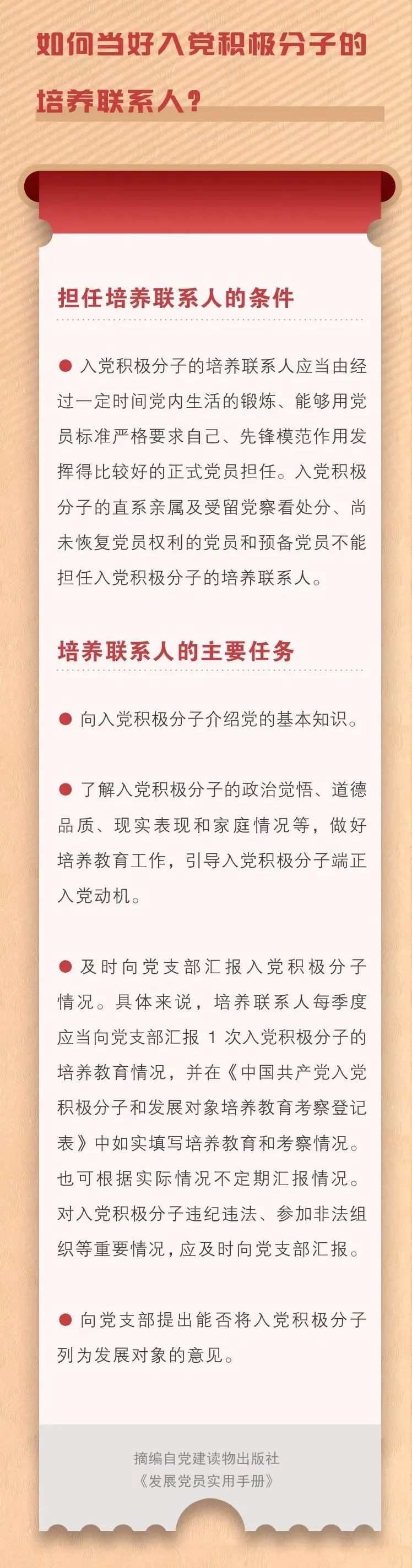 在发展党员工作中,党组织应当指定一至两名正式党员作入党积极分子的培养联系人。党员要当好入党积极分子的培养联系人,就要对培养联系人的担任条件、主要任务有所了解。今天,我们就一起来学习。