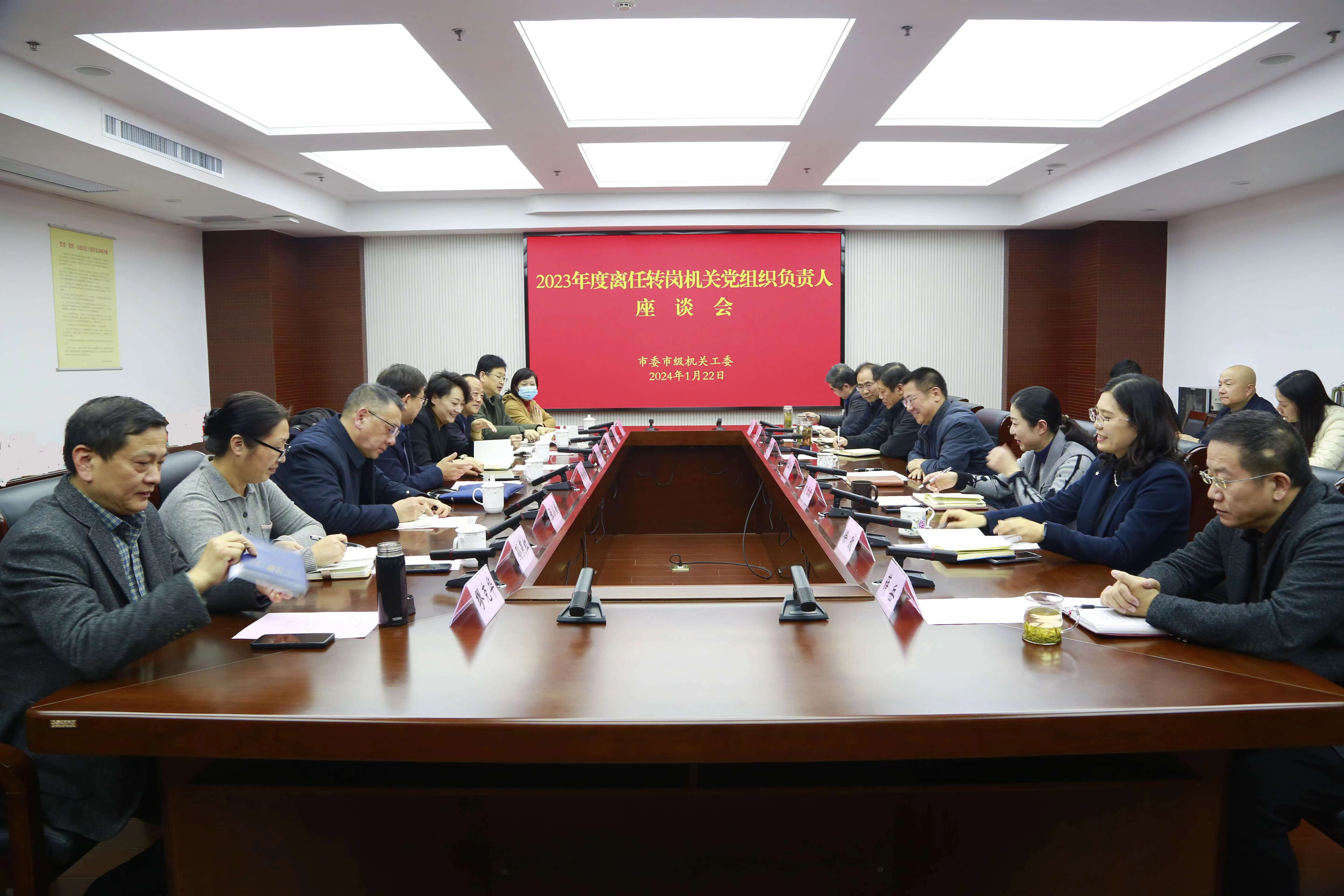 2024年1月22日下午,市委市级机关工委召开2023年度离任转岗机关党组织负责人座谈会,来自市委办公厅、市政府办公厅、市委编办、市检察院、市人社局等部门单位的离任转岗机关党组织书记、专职副书记代表齐聚一堂,分享从事机关党建工作的经验与感悟,为提高机关党建工作质效积极建言献策。市委市级机关工委常务副书记林其坤出席并讲话,工委领导班子成员和相关处室负责人参加会议。
