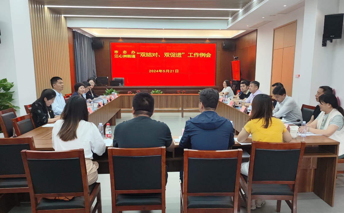为贯彻落实市委办公厅《关于开展市级机关企事业单位和全市各街道(镇)“双结对、双促进”工作的实施方案》工作要求,推动资源力量下沉街道及社区,5月21日,市志办与建邺区江心洲街道开展挂钩联系、双向结对工作。市志办党组书记、主任姜巧玲率班子成员汤林平、郑国军及机关党委工作人员赴江心洲街道开展对接,江心洲街道党工委书记刘雪涛,副书记、主任王彬及街道班子成员、各社区党组织书记参加座谈。