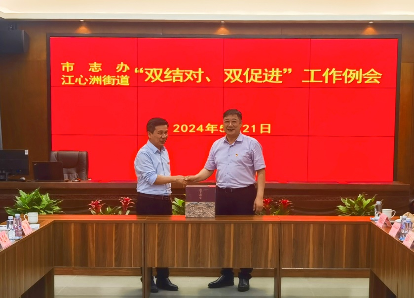 会上,刘雪涛及街道相关负责人对江心洲街道的经济发展、党建联盟、基层治理等方面作了详细介绍,同时结合“双结对、双促进”要求,对结对共建活动作出初步计划并提出“需求清单”。市志办参会领导班子成员结合分管工作就结对共建活动提出建议,列出“资源清单”,并向江心洲街道赠送方志书籍。