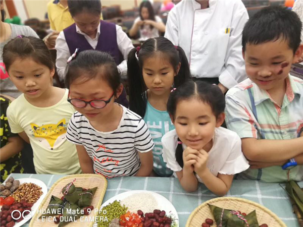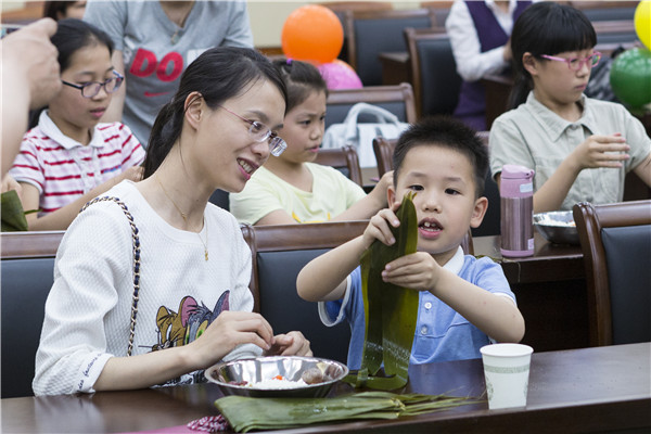 活动开始先进行了简单的热身运动,小朋友们和家长一起完成了“小脚踩大脚”、“双管齐下”等亲子游艺互动,通过分组竞技积分选出了获胜组,现场气氛热烈,欢声笑语不断。亲子运动结束后,在指导老师的引导下,小朋友们先了解了端午节的由来和包粽子、划龙舟等相关传统民俗,接着老师展示了粽子的制作方法,并且介绍了北方粽子多是简单糯米、赤豆、枣。而在南方,粽子口味丰富,豆沙、蛋黄、排骨、蜜枣、莲蓉等都可以作为馅料和糯米一起做成粽子。“把三片粽叶叠起慢慢卷成一个三角卷儿,用手掌和拇指捏紧后往里面灌入糯米、枣子等......”在现场,小朋友们和家长一起动手包粽子。