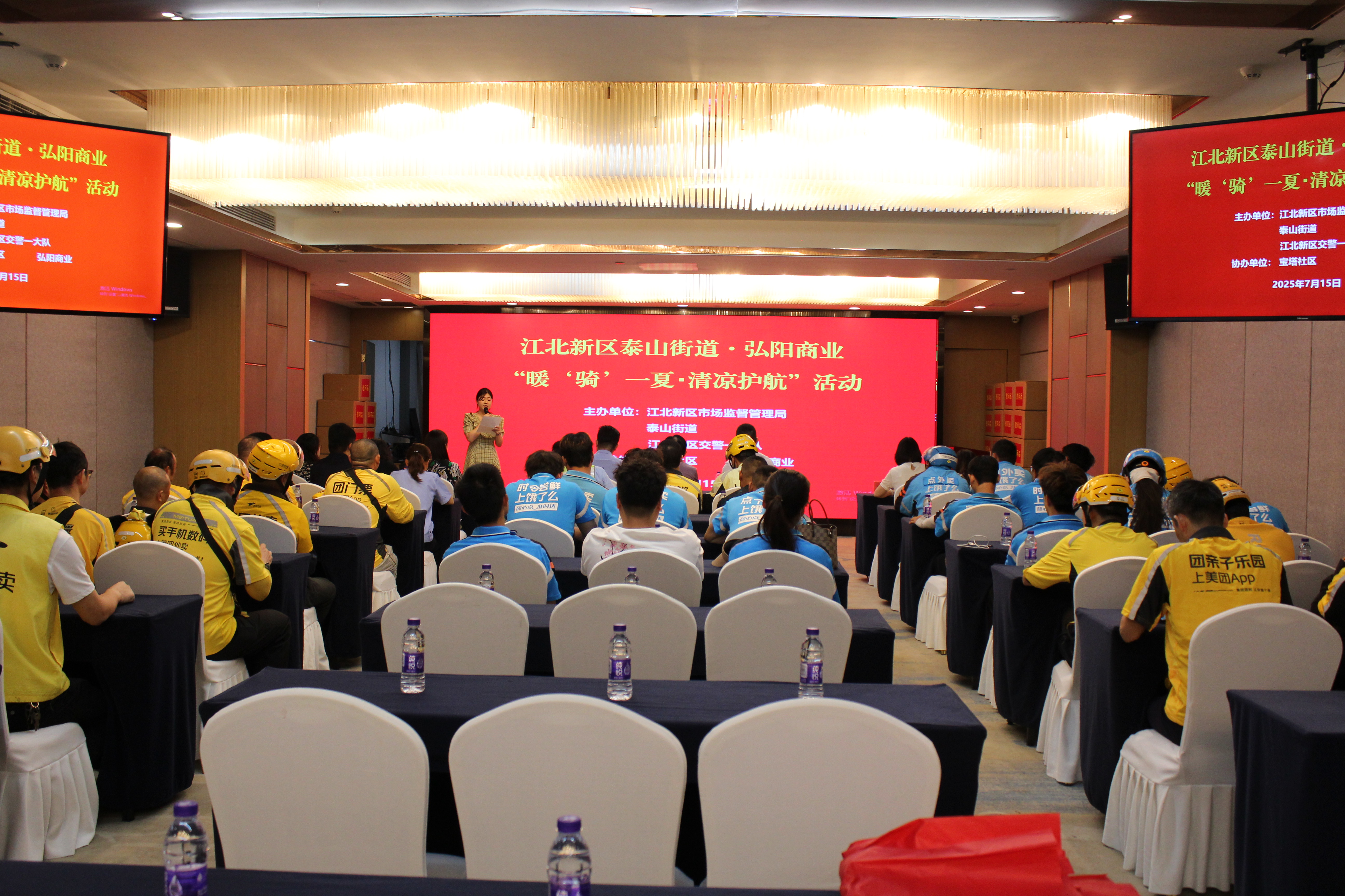 南京的夏天,骄阳似火,柏油路面被晒得滚烫,空气中弥漫着热浪。当大多数人都在空调房里避暑时,外卖骑手们穿梭在大街小巷,依旧顶着酷暑奔波,用汗水守护着千家万户的用餐需求。7月15日,江北新区外卖配送行业党委与江北新区泰山街道联合举办“暖‘骑’一夏・清凉护航”主题活动,为奔波的骑手们送去沁人心脾的清凉。