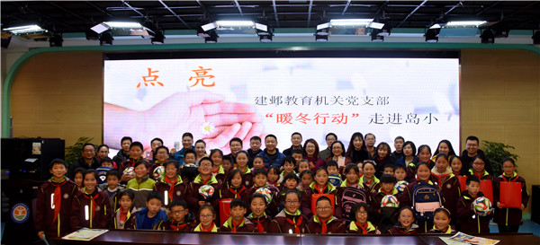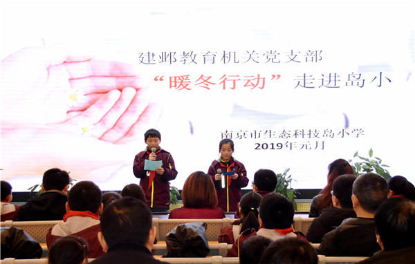 1月22日下午,建邺区教育局机关党支部全体党员来到南京市生态科技岛小学,将30余份充满爱心的礼物送到特困学生手中,与孩子们一起点亮“暖冬”行动。