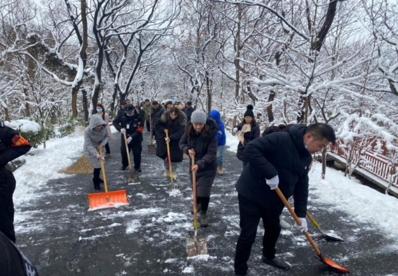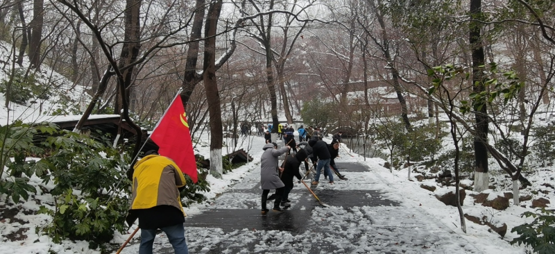 但大雪的来临也给游客的游玩带来了不便。为了保证景区游客的出行安全,南京市栖霞山风景名胜区管理处党组紧急组织了百余名党员干部职工,上山清雪除冰保畅通,以实际行动践行“我为群众办实事”实践活动。