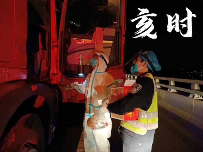 亥时:夜幕下的栖霞大桥收费站,少了白日里的车马声喧,少了白日里的喇叭播报,只有灯下不知疲倦的“战友”。由于管控措施升级,部分大货车滞留在高速公路口。考虑到许多货车司机一路奔波,查验点为等候查验的驾驶员送上爱心餐。