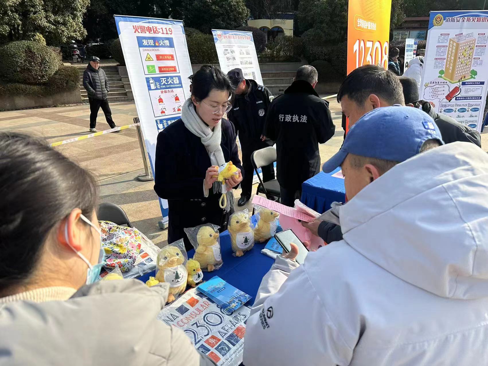 公益宣传服务区设立了退役军人咨询台、家事调解工作台、防诈骗普法台等展位,为居民提供咨询、调解、普法等服务。在海外领事保护知识普及台前,区政府办(外事办)涉外服务科负责人热心地向居民宣讲《中华人民共和国领事保护与协助条例》,并通过发放宣传册、文化袋、“安全呀(鸭)”等特制宣传品,普及12308全球领事保护热线及其他领保知识,提升社会公众海外领保意识和能力。“我儿子是一名海员,经常会随船到世界各地,现在有的国家不太平,我特别担心。有了12308这个全球通用的号码,关键时刻能起作用。”前来参与活动的刘大妈认真听完讲解,并表示之前并不知道国家开通了这条热线,现在一定要让儿子牢牢记住这个管用的号码。