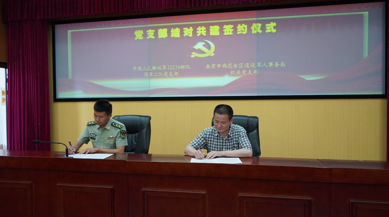 6月4日,雨花台区退役军人事务局机关党支部与32230部队保障二队党支部举行支部结对共建签约仪式。雨花台区区双拥办副主任、退役军人事务局党委副书记汪晨,退役军人事务局党委委员、机关党支部书记孟凡群和32230部队相关领导出席签约仪式。