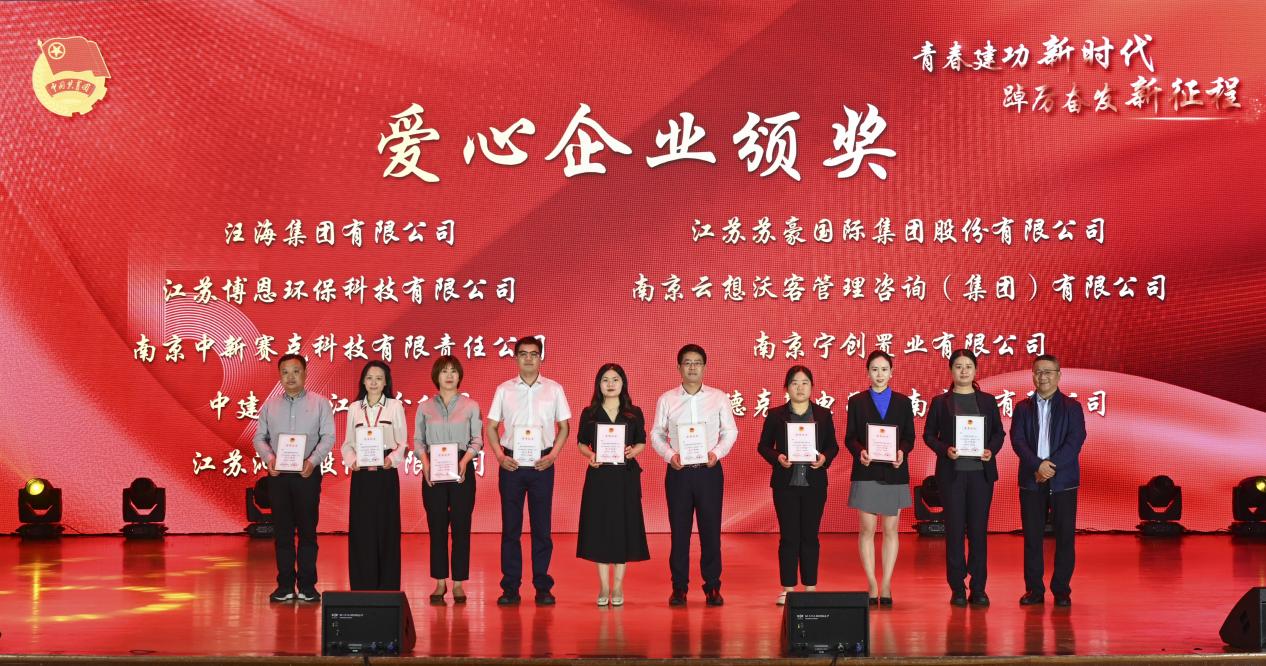 中国(南京)软件谷副主任张海毅为获得2022年度雨花台区“雨爱同行”项目爱心单位的企业代表颁奖。