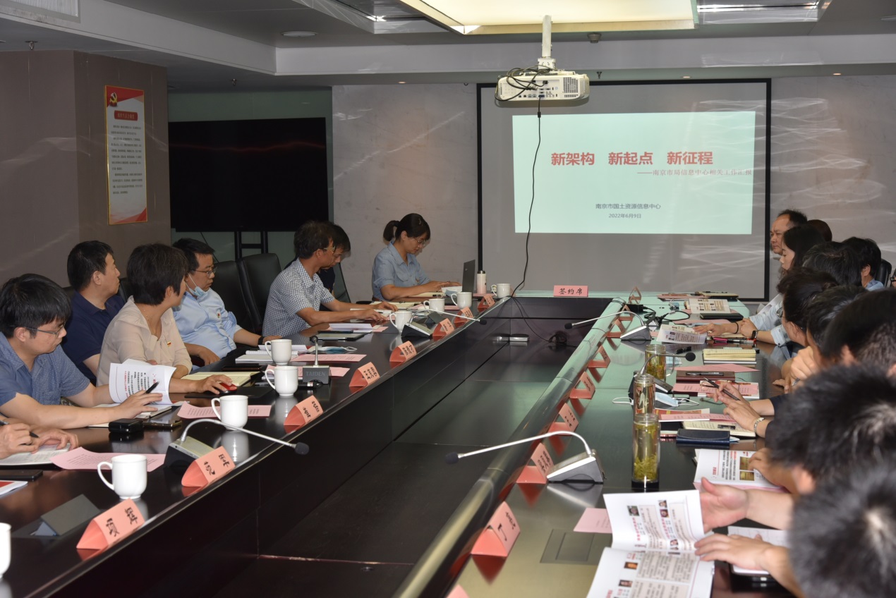 而后,南京市国土资源信息中心党支部书记、主任王芙蓉以《新架构新起点新征程》为题,向省自然资源厅信息中心介绍了中心基本情况、党的建设、信息化工作情况等。表示,2019年机构改革以来,南京市局信息中心在省自然资源厅和市局的坚强领导和大力支持下,在省厅信息中心的关心、指导、帮助下,在全国副省级城市中率先完成了信息化顶层设计等重要任务,代表信息中心向省自然资源厅信息中心表示感谢。今年4月,南京市局信息中心在局领导的关心指导下,顺利完成了内设机构的调整,形成了职能清晰、融合互补的“2+7”组织架构,希望新的架构能够尽快与省自然资源厅信息中心相关部门无缝对接,更好开展工作。当前,省市“共学共建”已成为推动工作的常态模式。近年来,信息中心坚持党建引领,着力推动党建与业务深度融合,结合相关任务,与省地质环境研究所党支部、南京市妇联机关第二党支部等省市有关单位开展了全方位的“共学共建”。在党的建设上,形成了“顶层设计强统领、特色塑造建渠道、创新活动抓落实、培养队伍添动力、共学共建促发展”等经验做法,取得了获南京市三八红旗单位、巾帼文明岗、工人先锋号荣誉等成绩;在业务工作上,信息中心聚焦“信息化建设统筹、制度和标准供给、网络信息安全、‘一张图’数据治理、国土空间基础信息平台建设、调查监测应用体系、政务服务应用体系、监管决策应用体系、智慧城市建设”等9项内容,取得了一系列的成绩。希望与省自然资源厅信息中心在党建和业务上开展更多交流合作,在省自然资源厅信息中心的进一步指导下,在双方“共学共建”中,取得更多成绩和成效。