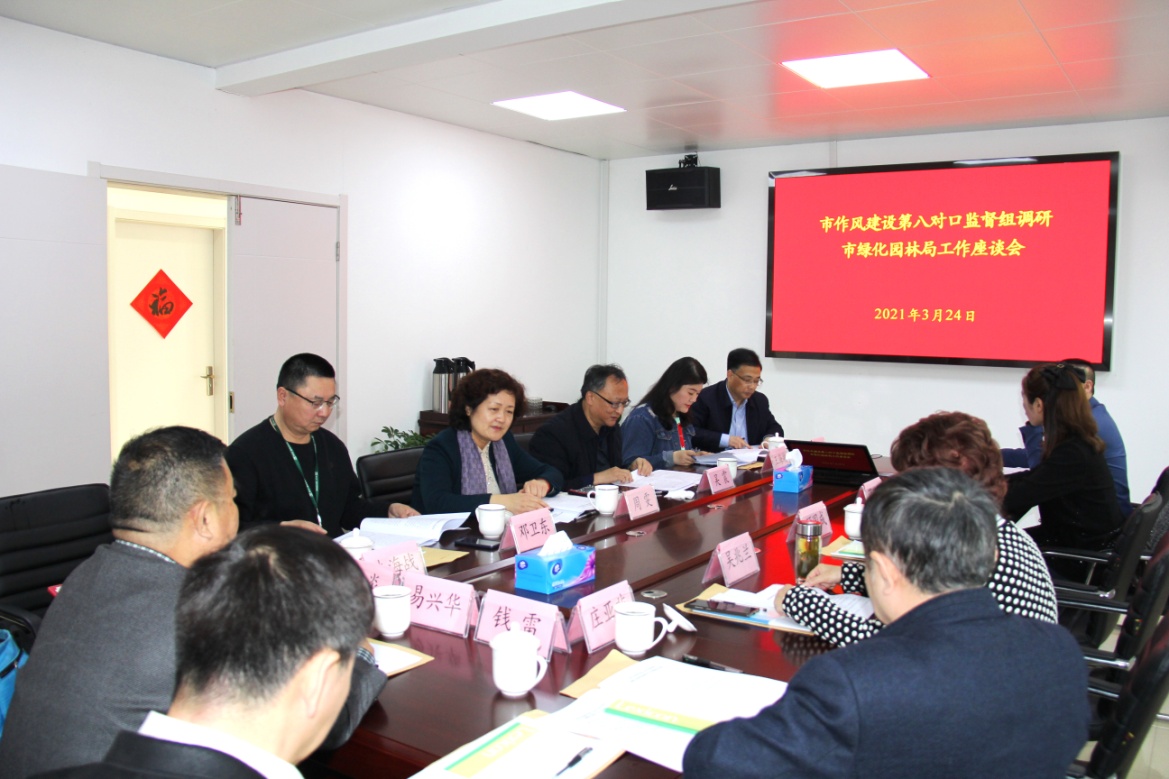 3月24日下午,市作风建设第八对口监督组调研市绿化园林局为民办实事项目,并就2020年以来局作风建设工作情况进行座谈交流。市作风办副主任顾国成、监督处处长薛爱国、市作风建设第八对口监督组全体人员和市绿化园林局主要领导、分管领导参加了会议。